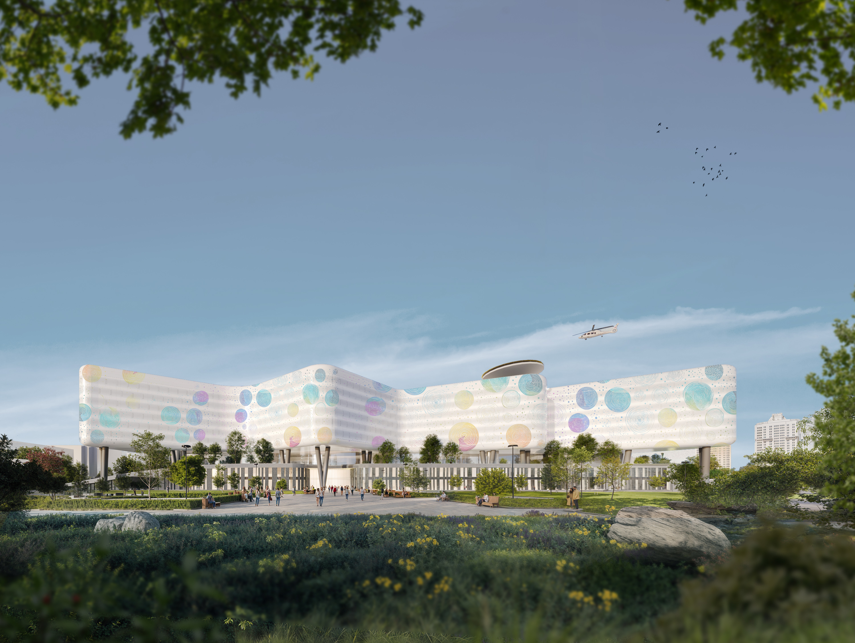Проектом предусматривается 10-этажное здание, включая 3-этажный стилобат. Стилобат имеет прямоугольную вытянутую форму с понижением с восточной стороны до уровня земли, тем самым организуя зеленую кровлю. На стилобате располагается 7-этажный объем палатных отделений, включая уменьшенный в периметре этаж с эксплуатируемой кровлей на стилобате и верхний этаж с административными помещениями.